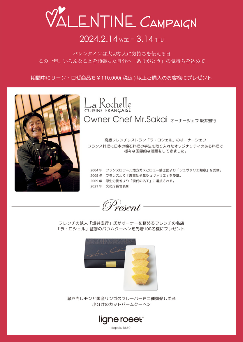期間中に、実店舗またはオフィシャル オンラインショップで、リーン・ロゼ製品を110,000円(税込)以上ご購入後、専用フォームからご応募頂くと、先着100名様に「ラ・ロシェル監修のバウムクーヘン」をプレゼント。
